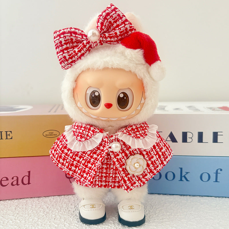 17cm Doll Clothes 5-Piece Set - Luxury Tweed Cape Outfit with Pearl & Camellia Details, Compatible with Labubu Dolls, Doll Accessories