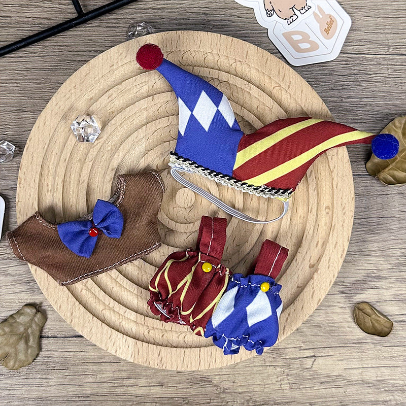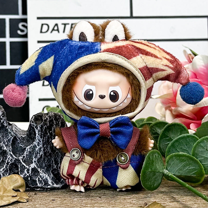 â¨ăVintage Circus Jester StyleăFeatures a color-blocked hat, striped romper, and contrasting bow tie, recreating the classic jester vibe. Pom-pom and button details turn Labubu into a eye-catching cosplay lookâ ideal for stunning photos.